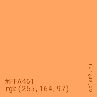 Цвет #FFA461 в цветовой модели RGB обозначается тремя октетами (255, 164, 97) в десятичном формате и #FFA461 в шестнадцатиричном (hex) формате, которые являются интенсивностью красного 255 (hex FF), интенсивность зелёного 164 (hex A4) и интенсивность синего 97 (hex 61).