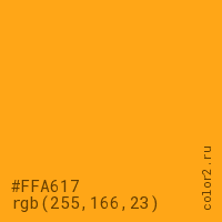 Цвет #FFA617 в цветовой модели RGB обозначается тремя октетами (255, 166, 23) в десятичном формате и #FFA617 в шестнадцатиричном (hex) формате, которые являются интенсивностью красного 255 (hex FF), интенсивность зелёного 166 (hex A6) и интенсивность синего 23 (hex 17).
