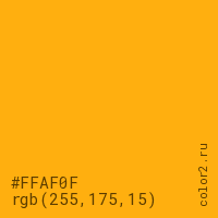 Цвет #FFAF0F в цветовой модели RGB обозначается тремя октетами (255, 175, 15) в десятичном формате и #FFAF0F в шестнадцатиричном (hex) формате, которые являются интенсивностью красного 255 (hex FF), интенсивность зелёного 175 (hex AF) и интенсивность синего 15 (hex 0F).
