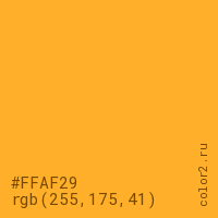 Цвет #FFAF29 в цветовой модели RGB обозначается тремя октетами (255, 175, 41) в десятичном формате и #FFAF29 в шестнадцатиричном (hex) формате, которые являются интенсивностью красного 255 (hex FF), интенсивность зелёного 175 (hex AF) и интенсивность синего 41 (hex 29).