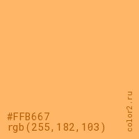 Цвет #FFB667 в цветовой модели RGB обозначается тремя октетами (255, 182, 103) в десятичном формате и #FFB667 в шестнадцатиричном (hex) формате, которые являются интенсивностью красного 255 (hex FF), интенсивность зелёного 182 (hex B6) и интенсивность синего 103 (hex 67).