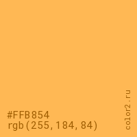 Цвет #FFB854 в цветовой модели RGB обозначается тремя октетами (255, 184, 84) в десятичном формате и #FFB854 в шестнадцатиричном (hex) формате, которые являются интенсивностью красного 255 (hex FF), интенсивность зелёного 184 (hex B8) и интенсивность синего 84 (hex 54).