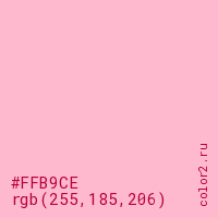 Цвет RGB(255, 185, 206) в процентом отношении количества цвета состоит из 100% красного (red), 72.5% зелёного (green) и 80.8% синего (blue).