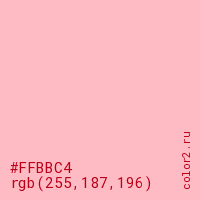 Цвет #FFBBC4 в цветовой модели RGB обозначается тремя октетами (255, 187, 196) в десятичном формате и #FFBBC4 в шестнадцатиричном (hex) формате, которые являются интенсивностью красного 255 (hex FF), интенсивность зелёного 187 (hex BB) и интенсивность синего 196 (hex C4).