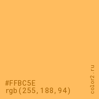 Цвет #FFBC5E в цветовой модели RGB обозначается тремя октетами (255, 188, 94) в десятичном формате и #FFBC5E в шестнадцатиричном (hex) формате, которые являются интенсивностью красного 255 (hex FF), интенсивность зелёного 188 (hex BC) и интенсивность синего 94 (hex 5E).