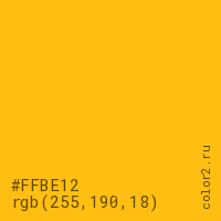 Цвет #FFBE12 в цветовой модели RGB обозначается тремя октетами (255, 190, 18) в десятичном формате и #FFBE12 в шестнадцатиричном (hex) формате, которые являются интенсивностью красного 255 (hex FF), интенсивность зелёного 190 (hex BE) и интенсивность синего 18 (hex 12).