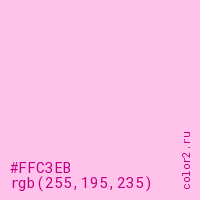 Цвет #FFC3EB в цветовой модели RGB обозначается тремя октетами (255, 195, 235) в десятичном формате и #FFC3EB в шестнадцатиричном (hex) формате, которые являются интенсивностью красного 255 (hex FF), интенсивность зелёного 195 (hex C3) и интенсивность синего 235 (hex EB).