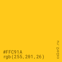 Цвет RGB(255, 201, 26) в процентом отношении количества цвета состоит из 100% красного (red), 78.8% зелёного (green) и 10.2% синего (blue).