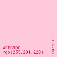 Цвет #FFC9DC в цветовой модели RGB обозначается тремя октетами (255, 201, 220) в десятичном формате и #FFC9DC в шестнадцатиричном (hex) формате, которые являются интенсивностью красного 255 (hex FF), интенсивность зелёного 201 (hex C9) и интенсивность синего 220 (hex DC).