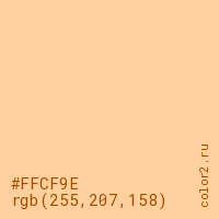 Цвет #FFCF9E в цветовой модели RGB обозначается тремя октетами (255, 207, 158) в десятичном формате и #FFCF9E в шестнадцатиричном (hex) формате, которые являются интенсивностью красного 255 (hex FF), интенсивность зелёного 207 (hex CF) и интенсивность синего 158 (hex 9E).