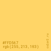 Цвет #FFD567 в цветовой модели RGB обозначается тремя октетами (255, 213, 103) в десятичном формате и #FFD567 в шестнадцатиричном (hex) формате, которые являются интенсивностью красного 255 (hex FF), интенсивность зелёного 213 (hex D5) и интенсивность синего 103 (hex 67).