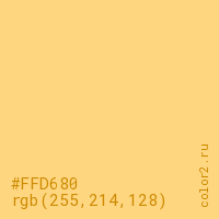 Цвет #FFD680 в цветовой модели RGB обозначается тремя октетами (255, 214, 128) в десятичном формате и #FFD680 в шестнадцатиричном (hex) формате, которые являются интенсивностью красного 255 (hex FF), интенсивность зелёного 214 (hex D6) и интенсивность синего 128 (hex 80).