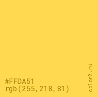 Цвет #FFDA51 в цветовой модели RGB обозначается тремя октетами (255, 218, 81) в десятичном формате и #FFDA51 в шестнадцатиричном (hex) формате, которые являются интенсивностью красного 255 (hex FF), интенсивность зелёного 218 (hex DA) и интенсивность синего 81 (hex 51).