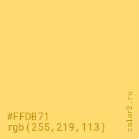 Цвет #FFDB71 в цветовой модели RGB обозначается тремя октетами (255, 219, 113) в десятичном формате и #FFDB71 в шестнадцатиричном (hex) формате, которые являются интенсивностью красного 255 (hex FF), интенсивность зелёного 219 (hex DB) и интенсивность синего 113 (hex 71).