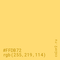 Цвет #FFDB72 в цветовой модели RGB обозначается тремя октетами (255, 219, 114) в десятичном формате и #FFDB72 в шестнадцатиричном (hex) формате, которые являются интенсивностью красного 255 (hex FF), интенсивность зелёного 219 (hex DB) и интенсивность синего 114 (hex 72).