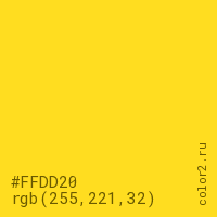 Цвет #FFDD20 в цветовой модели RGB обозначается тремя октетами (255, 221, 32) в десятичном формате и #FFDD20 в шестнадцатиричном (hex) формате, которые являются интенсивностью красного 255 (hex FF), интенсивность зелёного 221 (hex DD) и интенсивность синего 32 (hex 20).