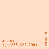 Цвет #FFDEC8 в цветовой модели RGB обозначается тремя октетами (255, 222, 200) в десятичном формате и #FFDEC8 в шестнадцатиричном (hex) формате, которые являются интенсивностью красного 255 (hex FF), интенсивность зелёного 222 (hex DE) и интенсивность синего 200 (hex C8).