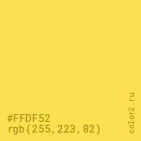 Цвет #FFDF52 в цветовой модели RGB обозначается тремя октетами (255, 223, 82) в десятичном формате и #FFDF52 в шестнадцатиричном (hex) формате, которые являются интенсивностью красного 255 (hex FF), интенсивность зелёного 223 (hex DF) и интенсивность синего 82 (hex 52).