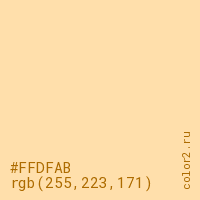 Цвет #FFDFAB в цветовой модели RGB обозначается тремя октетами (255, 223, 171) в десятичном формате и #FFDFAB в шестнадцатиричном (hex) формате, которые являются интенсивностью красного 255 (hex FF), интенсивность зелёного 223 (hex DF) и интенсивность синего 171 (hex AB).
