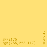 Цвет #FFE175 в цветовой модели RGB обозначается тремя октетами (255, 225, 117) в десятичном формате и #FFE175 в шестнадцатиричном (hex) формате, которые являются интенсивностью красного 255 (hex FF), интенсивность зелёного 225 (hex E1) и интенсивность синего 117 (hex 75).