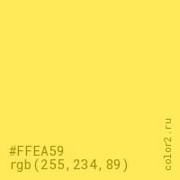 Цвет #FFEA59 в цветовой модели RGB обозначается тремя октетами (255, 234, 89) в десятичном формате и #FFEA59 в шестнадцатиричном (hex) формате, которые являются интенсивностью красного 255 (hex FF), интенсивность зелёного 234 (hex EA) и интенсивность синего 89 (hex 59).
