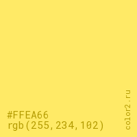 Цвет #FFEA66 в цветовой модели RGB обозначается тремя октетами (255, 234, 102) в десятичном формате и #FFEA66 в шестнадцатиричном (hex) формате, которые являются интенсивностью красного 255 (hex FF), интенсивность зелёного 234 (hex EA) и интенсивность синего 102 (hex 66).