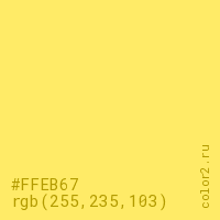 Цвет #FFEB67 в цветовой модели RGB обозначается тремя октетами (255, 235, 103) в десятичном формате и #FFEB67 в шестнадцатиричном (hex) формате, которые являются интенсивностью красного 255 (hex FF), интенсивность зелёного 235 (hex EB) и интенсивность синего 103 (hex 67).