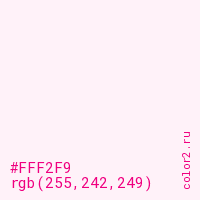 Цвет #FFF2F9 в цветовой модели RGB обозначается тремя октетами (255, 242, 249) в десятичном формате и #FFF2F9 в шестнадцатиричном (hex) формате, которые являются интенсивностью красного 255 (hex FF), интенсивность зелёного 242 (hex F2) и интенсивность синего 249 (hex F9).