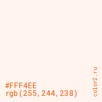 Цвет RGB(255, 244, 238) в процентом отношении количества цвета состоит из 100% красного (red), 95.7% зелёного (green) и 93.3% синего (blue).