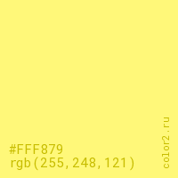 Цвет #FFF879 в цветовой модели RGB обозначается тремя октетами (255, 248, 121) в десятичном формате и #FFF879 в шестнадцатиричном (hex) формате, которые являются интенсивностью красного 255 (hex FF), интенсивность зелёного 248 (hex F8) и интенсивность синего 121 (hex 79).
