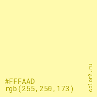 Цвет #FFFAAD в цветовой модели RGB обозначается тремя октетами (255, 250, 173) в десятичном формате и #FFFAAD в шестнадцатиричном (hex) формате, которые являются интенсивностью красного 255 (hex FF), интенсивность зелёного 250 (hex FA) и интенсивность синего 173 (hex AD).