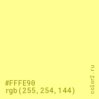 Цвет #FFFE90 в цветовой модели RGB обозначается тремя октетами (255, 254, 144) в десятичном формате и #FFFE90 в шестнадцатиричном (hex) формате, которые являются интенсивностью красного 255 (hex FF), интенсивность зелёного 254 (hex FE) и интенсивность синего 144 (hex 90).
