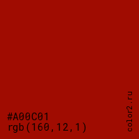 Цвет #A00C01 в цветовой модели RGB обозначается тремя октетами (160, 12, 1) в десятичном формате и #A00C01 в шестнадцатиричном (hex) формате, которые являются интенсивностью красного 160 (hex A0), интенсивность зелёного 12 (hex 0C) и интенсивность синего 1 (hex 01).