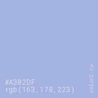 Цвет #A3B2DF в цветовой модели RGB обозначается тремя октетами (163, 178, 223) в десятичном формате и #A3B2DF в шестнадцатиричном (hex) формате, которые являются интенсивностью красного 163 (hex A3), интенсивность зелёного 178 (hex B2) и интенсивность синего 223 (hex DF).