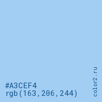 Цвет #A3CEF4 в цветовой модели RGB обозначается тремя октетами (163, 206, 244) в десятичном формате и #A3CEF4 в шестнадцатиричном (hex) формате, которые являются интенсивностью красного 163 (hex A3), интенсивность зелёного 206 (hex CE) и интенсивность синего 244 (hex F4).