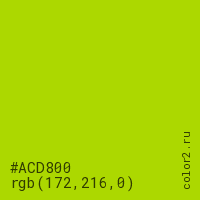 Цвет #ACD800 в цветовой модели RGB обозначается тремя октетами (172, 216, 0) в десятичном формате и #ACD800 в шестнадцатиричном (hex) формате, которые являются интенсивностью красного 172 (hex AC), интенсивность зелёного 216 (hex D8) и интенсивность синего 0 (hex 00).
