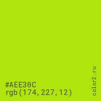 Цвет #AEE30C в цветовой модели RGB обозначается тремя октетами (174, 227, 12) в десятичном формате и #AEE30C в шестнадцатиричном (hex) формате, которые являются интенсивностью красного 174 (hex AE), интенсивность зелёного 227 (hex E3) и интенсивность синего 12 (hex 0C).