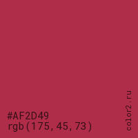 Цвет #AF2D49 в цветовой модели RGB обозначается тремя октетами (175, 45, 73) в десятичном формате и #AF2D49 в шестнадцатиричном (hex) формате, которые являются интенсивностью красного 175 (hex AF), интенсивность зелёного 45 (hex 2D) и интенсивность синего 73 (hex 49).