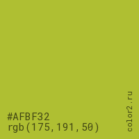 Цвет #AFBF32 в цветовой модели RGB обозначается тремя октетами (175, 191, 50) в десятичном формате и #AFBF32 в шестнадцатиричном (hex) формате, которые являются интенсивностью красного 175 (hex AF), интенсивность зелёного 191 (hex BF) и интенсивность синего 50 (hex 32).
