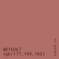 Цвет #B16D67 в цветовой модели RGB обозначается тремя октетами (177, 109, 103) в десятичном формате и #B16D67 в шестнадцатиричном (hex) формате, которые являются интенсивностью красного 177 (hex B1), интенсивность зелёного 109 (hex 6D) и интенсивность синего 103 (hex 67).