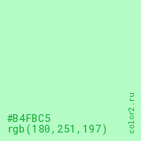 Цвет #B4FBC5 в цветовой модели RGB обозначается тремя октетами (180, 251, 197) в десятичном формате и #B4FBC5 в шестнадцатиричном (hex) формате, которые являются интенсивностью красного 180 (hex B4), интенсивность зелёного 251 (hex FB) и интенсивность синего 197 (hex C5).