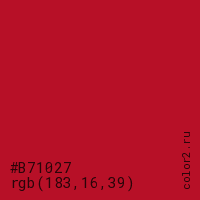 Цвет #B71027 в цветовой модели RGB обозначается тремя октетами (183, 16, 39) в десятичном формате и #B71027 в шестнадцатиричном (hex) формате, которые являются интенсивностью красного 183 (hex B7), интенсивность зелёного 16 (hex 10) и интенсивность синего 39 (hex 27).