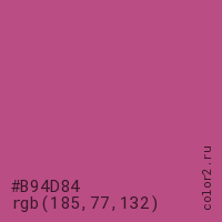 Цвет #B94D84 в цветовой модели RGB обозначается тремя октетами (185, 77, 132) в десятичном формате и #B94D84 в шестнадцатиричном (hex) формате, которые являются интенсивностью красного 185 (hex B9), интенсивность зелёного 77 (hex 4D) и интенсивность синего 132 (hex 84).