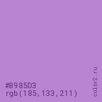 Цвет #B985D3 в цветовой модели RGB обозначается тремя октетами (185, 133, 211) в десятичном формате и #B985D3 в шестнадцатиричном (hex) формате, которые являются интенсивностью красного 185 (hex B9), интенсивность зелёного 133 (hex 85) и интенсивность синего 211 (hex D3).