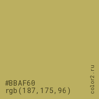 Цвет #BBAF60 в цветовой модели RGB обозначается тремя октетами (187, 175, 96) в десятичном формате и #BBAF60 в шестнадцатиричном (hex) формате, которые являются интенсивностью красного 187 (hex BB), интенсивность зелёного 175 (hex AF) и интенсивность синего 96 (hex 60).