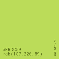 Цвет #BBDC59 в цветовой модели RGB обозначается тремя октетами (187, 220, 89) в десятичном формате и #BBDC59 в шестнадцатиричном (hex) формате, которые являются интенсивностью красного 187 (hex BB), интенсивность зелёного 220 (hex DC) и интенсивность синего 89 (hex 59).