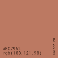 Цвет #BC7962 в цветовой модели RGB обозначается тремя октетами (188, 121, 98) в десятичном формате и #BC7962 в шестнадцатиричном (hex) формате, которые являются интенсивностью красного 188 (hex BC), интенсивность зелёного 121 (hex 79) и интенсивность синего 98 (hex 62).