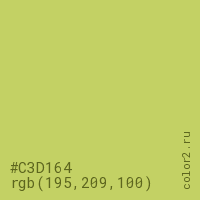 Цвет #C3D164 в цветовой модели RGB обозначается тремя октетами (195, 209, 100) в десятичном формате и #C3D164 в шестнадцатиричном (hex) формате, которые являются интенсивностью красного 195 (hex C3), интенсивность зелёного 209 (hex D1) и интенсивность синего 100 (hex 64).