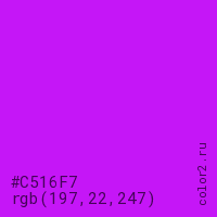 Цвет #C516F7 в цветовой модели RGB обозначается тремя октетами (197, 22, 247) в десятичном формате и #C516F7 в шестнадцатиричном (hex) формате, которые являются интенсивностью красного 197 (hex C5), интенсивность зелёного 22 (hex 16) и интенсивность синего 247 (hex F7).