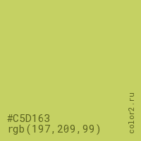 Цвет #C5D163 в цветовой модели RGB обозначается тремя октетами (197, 209, 99) в десятичном формате и #C5D163 в шестнадцатиричном (hex) формате, которые являются интенсивностью красного 197 (hex C5), интенсивность зелёного 209 (hex D1) и интенсивность синего 99 (hex 63).